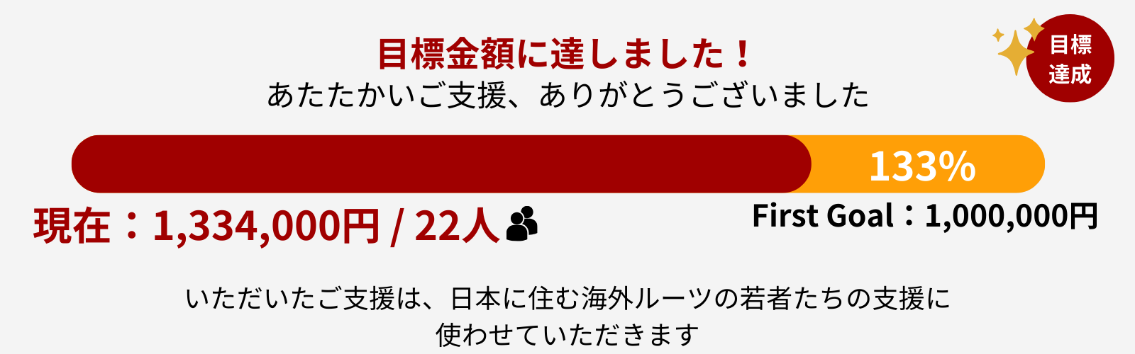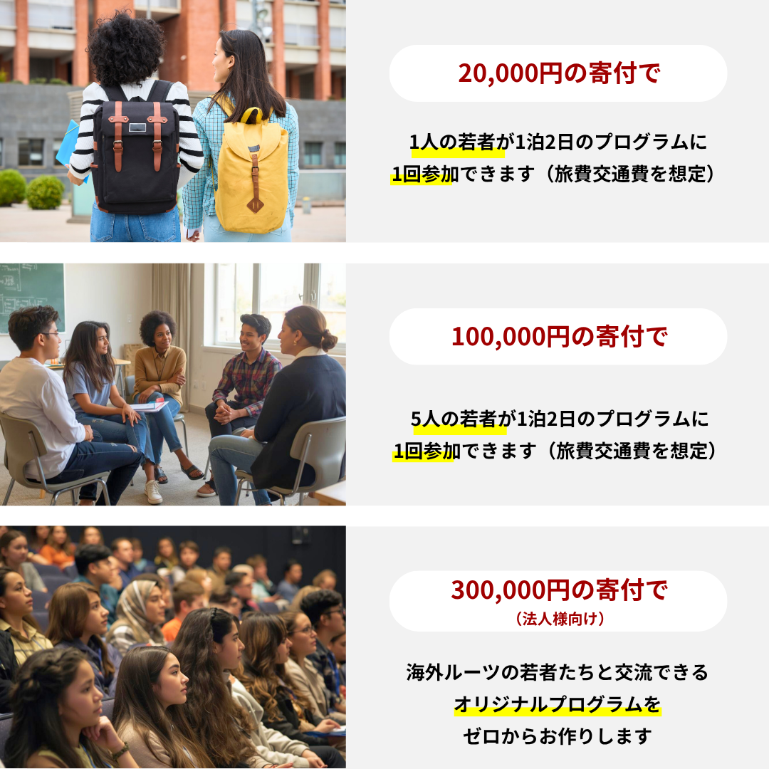 目標金額の100万円が集まると50人の海外ルーツの若者たちへ特別な体験プログラムを提供することができます。