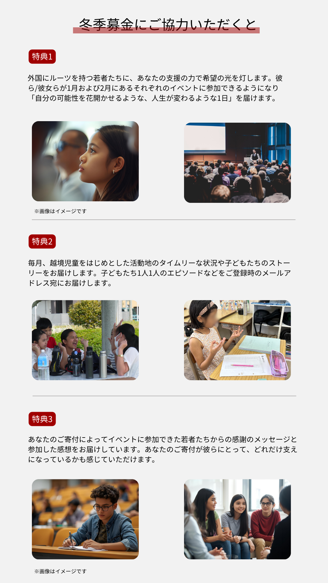 私たちは、これらのイベントに全国にいる海外ルーツの高校生や若者を招きたいと考えています。