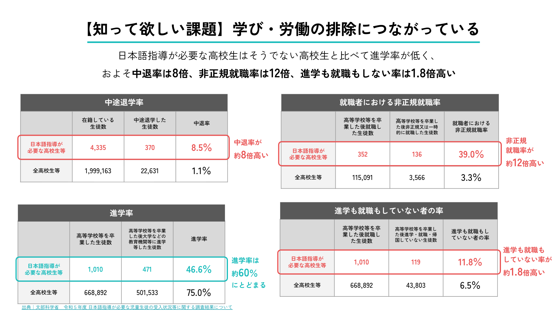 日本語指導が必要な高校生とそうでない高校生では、進学率に大きな差があることに加えて、進学も就職もしない率は1.8倍高いというデータもあります。