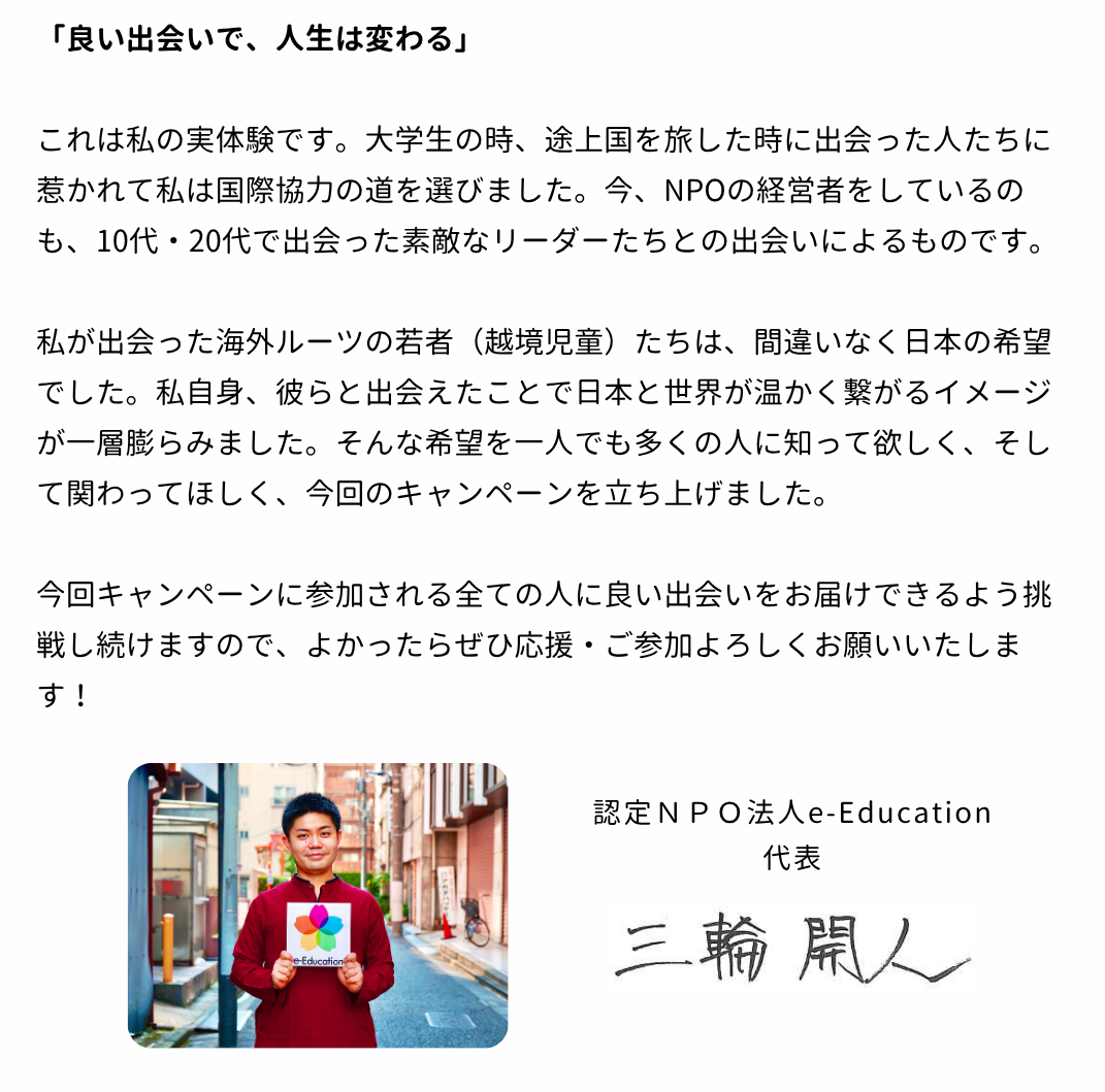 - 寄付したお金はどのように使われますか? 頂いたご寄付は日本に暮らす海外ルーツの若者が2026年1月と2月にイベントに参加するための資金に使わせていただきます。 なお、e-Educationの活動地であるバングラデシュやフィリピン、ネパールでも同様に経済格差の困難に直面しながらも一生懸命に勉強している子どもたちの支援にも使わせていただきます。