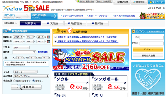 直前予約可能でビジネスマンに人気の「YAZIKITA(ヤジキタ)」。オープンジョーのチケット検索もできるのも便利です。また2014年現在、創設5周年を迎え、お得なセールを開催中。ぜひチェックしてみてください!