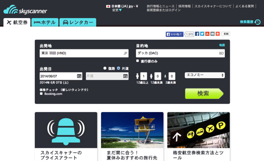 海外ホテルの予約で有名な「スカイゲート(現在はDeNAトラベル)」でも格安航空券を探すことができます。ホテル予約との連携が非常にスムーズなのがメリットですが、WEBトップ画面に表示されている航空券の価格には燃料代が含まれていないことに注意しましょう。