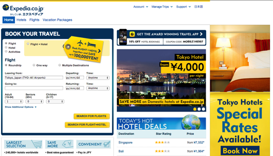 世界最大のオンライン旅行会社「Expedia(エクスペディア)」。日本語サイト(.co.jp)もありますがグローバルサイト(.com)も非常に使いやすいです。あまり知られていませんが、グローバルサイトで予約してもアフターサービスは日本語で受けることができ、こちらも凄く便利です。