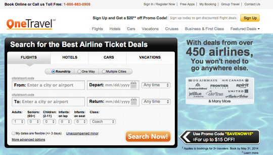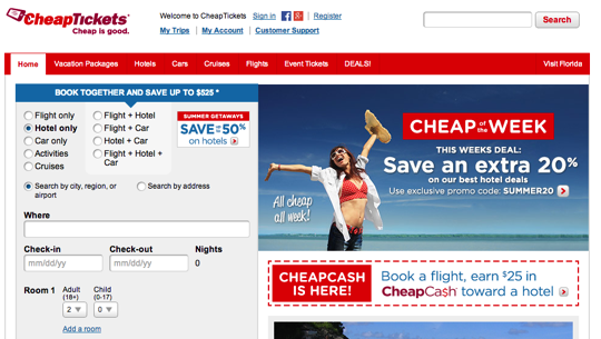 名前からもお分かりの通り、格安航空券をメインに扱っている「cheaptickets」。先ほど紹介したORBITZとほとんど同じ作り(同じ検索エンジン?)になっており、どちらか一方を知っていれば良いでしょう。