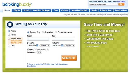 最後は少し特殊なサイト「bookingbuddy」。上で紹介したcheapOair、ORBITZ、OneTravel、cheapticketsといったサイトをまとめて同時検索してくれる便利サイトです。迷ったらとりあえずこのサイトを調べれば間違い無しです。