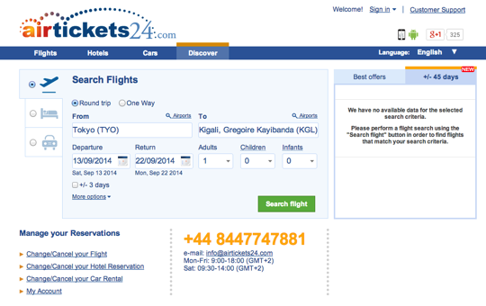 - 東京⇔ルワンダ(2014年9月13日〜9月22日※シルバーウィーク)