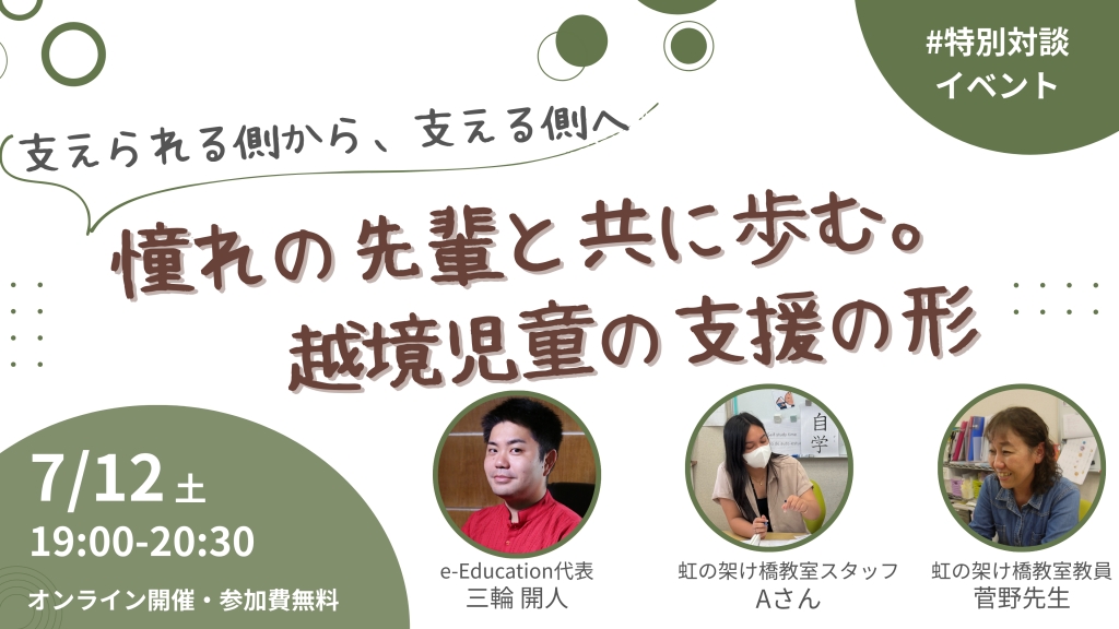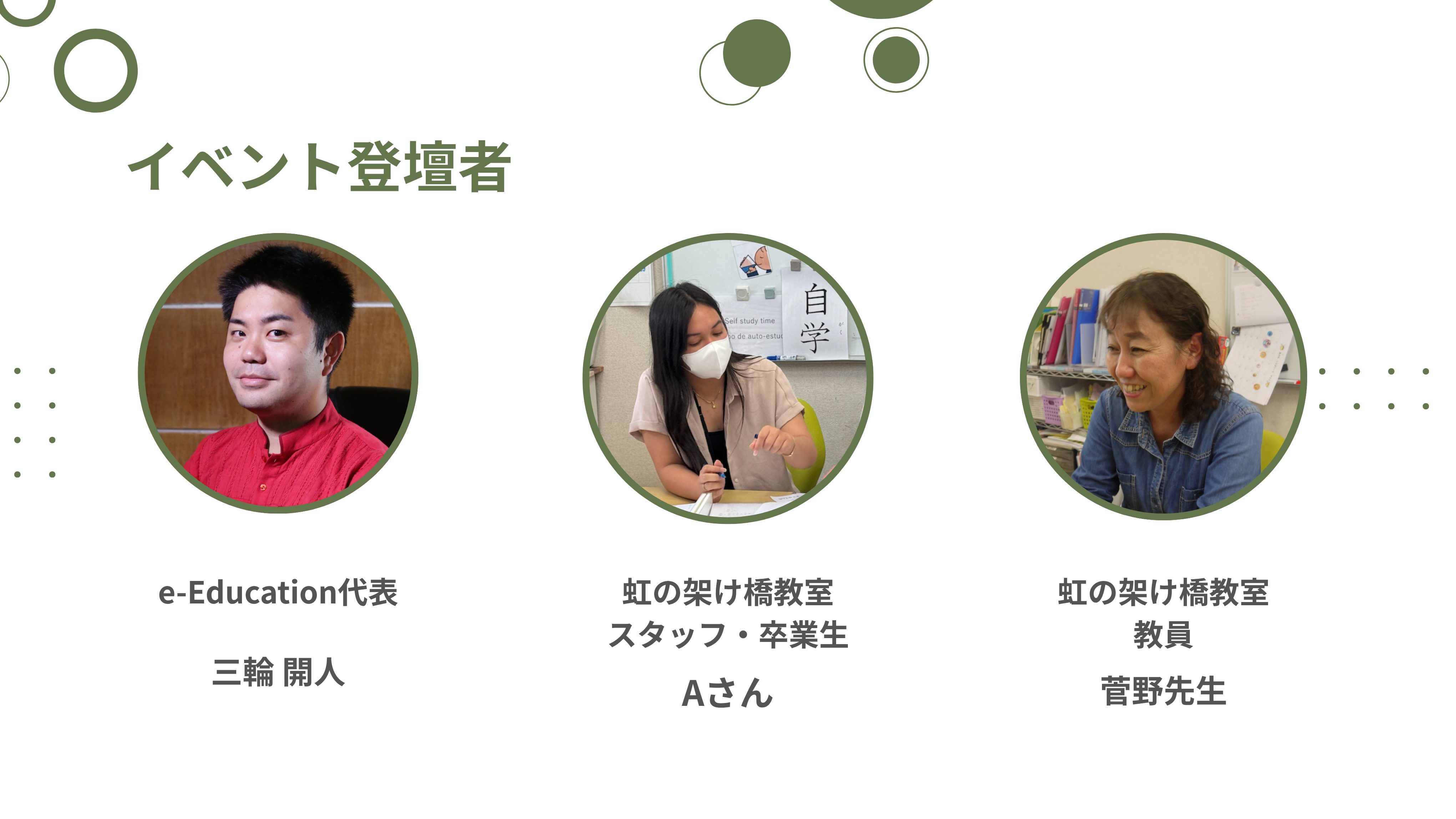 対談には、e-Education代表の三輪に加え、10年以上にわたってこの分野の先駆者として取り組まれてきた「虹の架け橋 菊川小笠教室」の菅野(すがの)先生、そしてスタッフのAさんが登壇します。