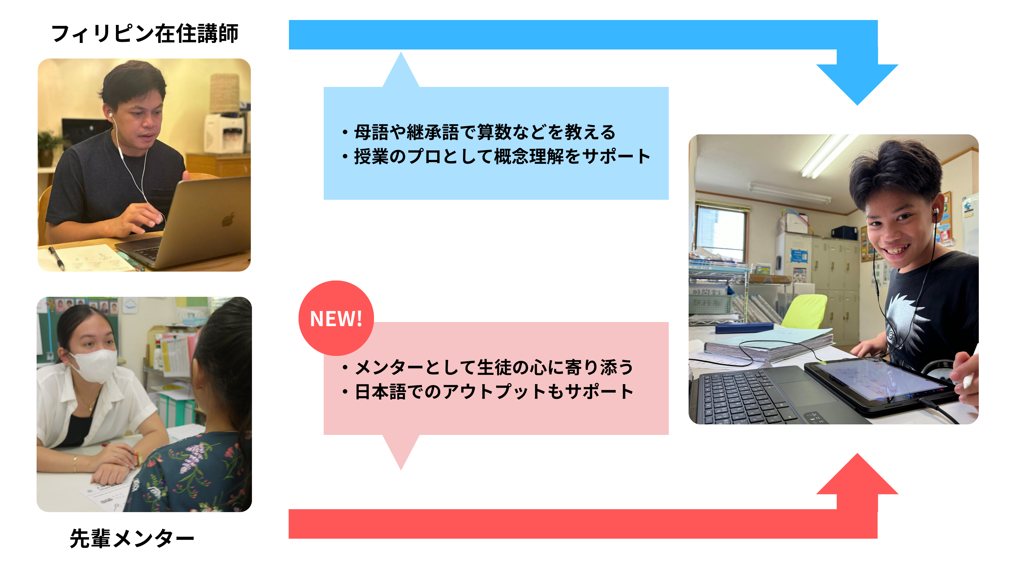 このモデルでは、小〜中学校時代に来日した先輩越境児童が、後輩たちをオンラインで個別伴走支援(メンタリング)をし、全国どこからでもサポートできる仕組みを整えます。