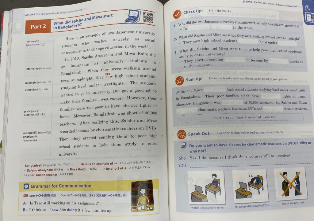 その題材の1つとしてe-Educationが選ばれ、高校1年生向けの英語教科書にe-Educationの創業時の話や活動内容が英語で描かれています。