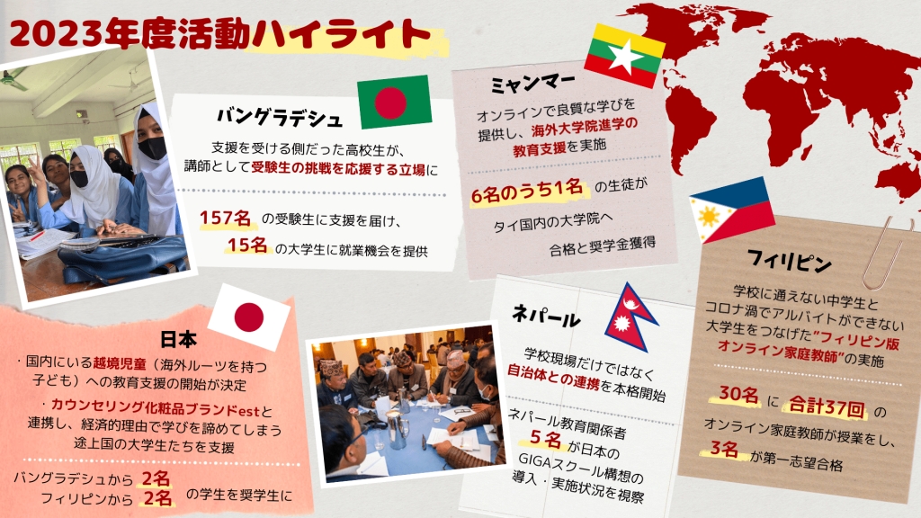 2023年度の年次活動報告書(2023年4月から2024年3月)が完成しました。昨年度、支援を行った各国での活動とその成果を紹介しています。