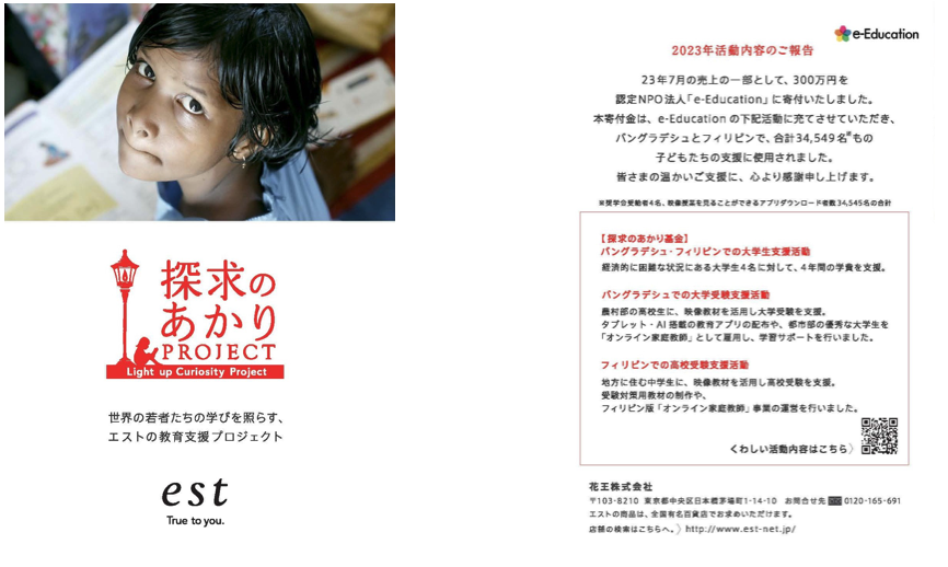 花王グループのプレステージ化粧品ブランド「est(エスト)」(以下エスト)は持続可能な社会の実現に向けた取り組みの一環として、2022年より私たちe-Educationの活動をご支援してくださっています。