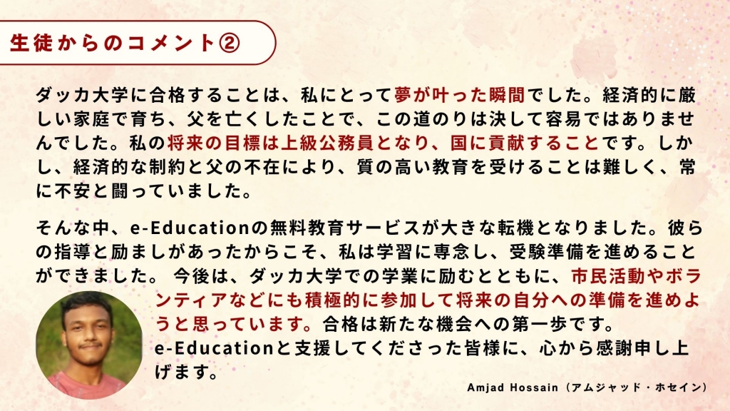 今回の合格速報の最後に、同じくダッカ大学に合格した生徒からのメッセージをご紹介したいと思います。