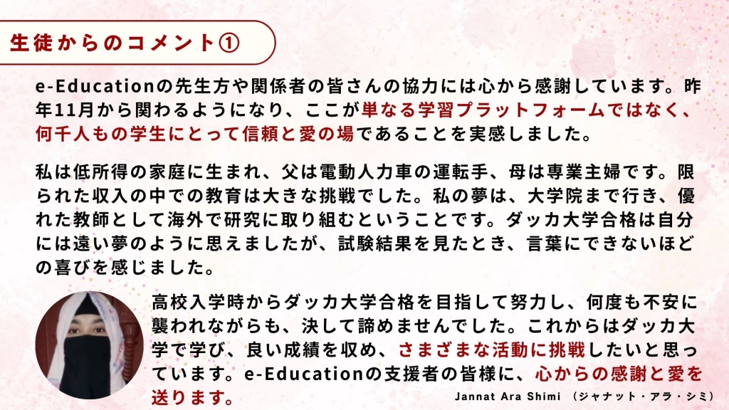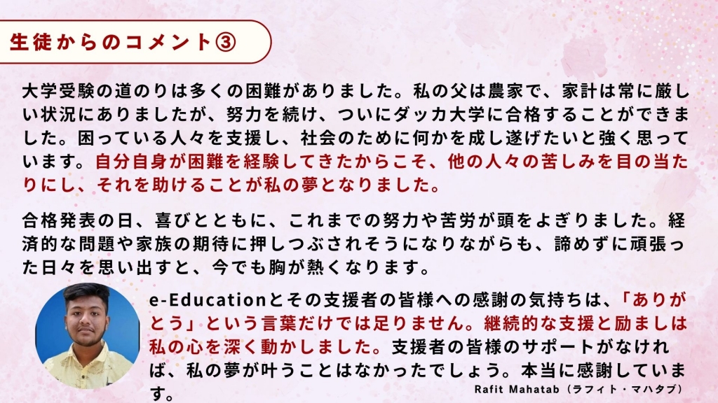 「私のように経済的に困難な状況にある学生にとって、e-Educationは本当にかけがえのない存在です。多くの学生が金銭的な理由で教育を諦めざるを得ない中、e-Educationの支援は、私たちの夢をつなぎ留める希望です。私の夢を追い続けるチャンスをくださったことを、心から感謝申し上げます。」