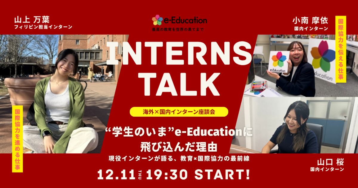 「インターンは初めてで、自分にできるのか不安」「広報の経験がなくて自信がない」 そう感じている方も、どうか安心してください。e-Educationでは先輩インターンや職員が業務の進め方はもちろん、悩みや不安にも寄り添いながら、一緒に伴走します。一緒に「最高の教育を世界の果てまで」に挑戦しましょう!