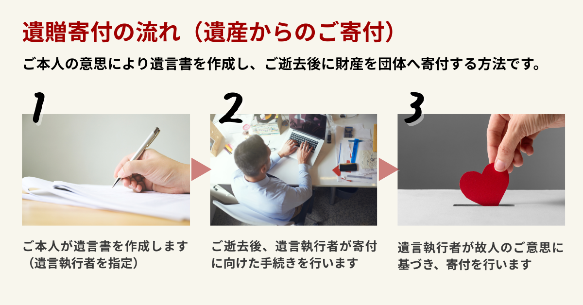 現金によるご寄付は、遺贈寄付の場合には、遺言書に寄付先として