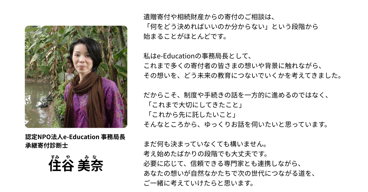 「特定非営利活動法人e-Education」 とご記載いただくことで実現できます。また、相続寄付の場合も、相続した財産からご寄付をいただくかたちですので、ご家族や関係者の手続き的なご負担を抑えながら進めていただける方法です。